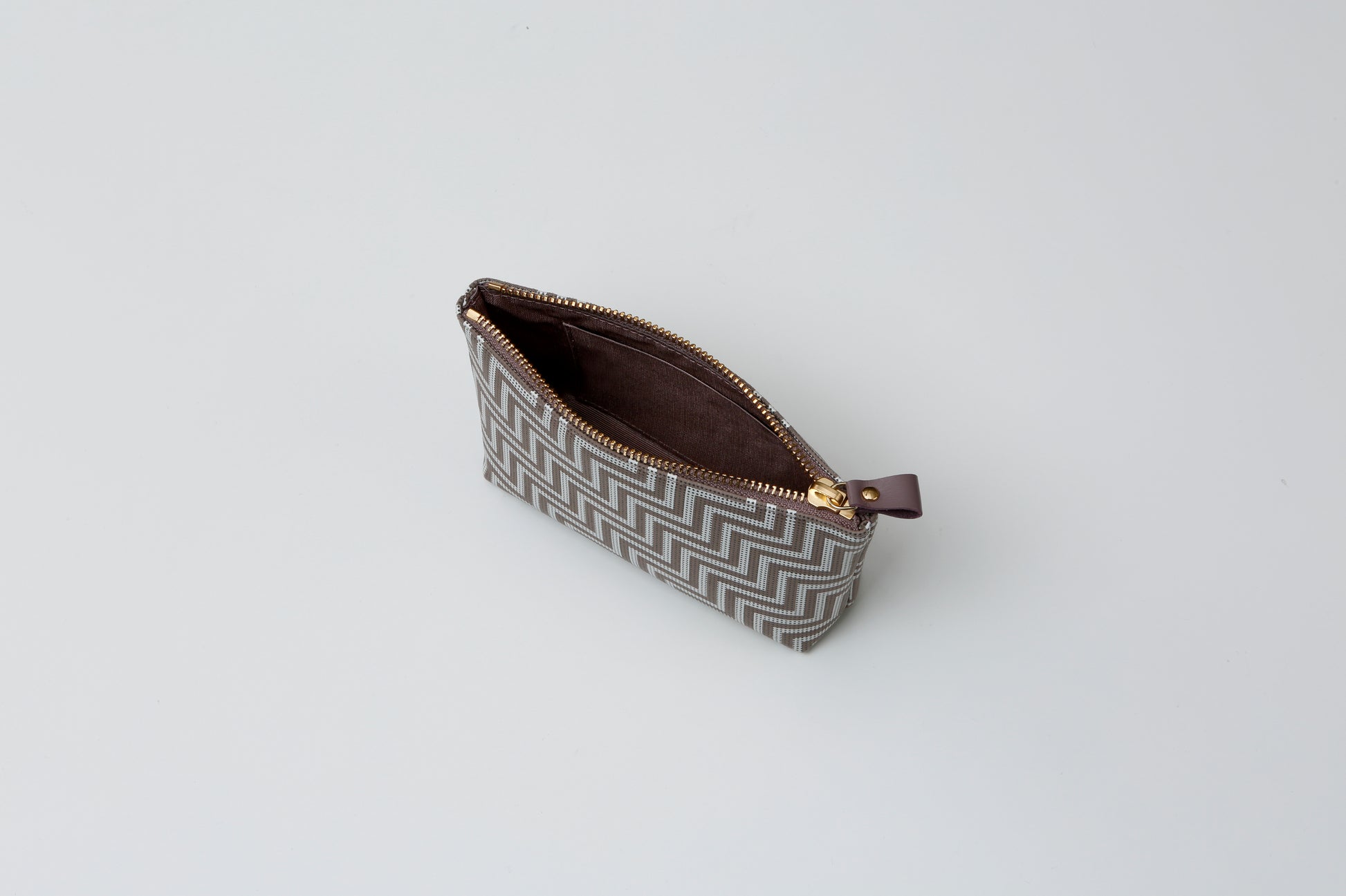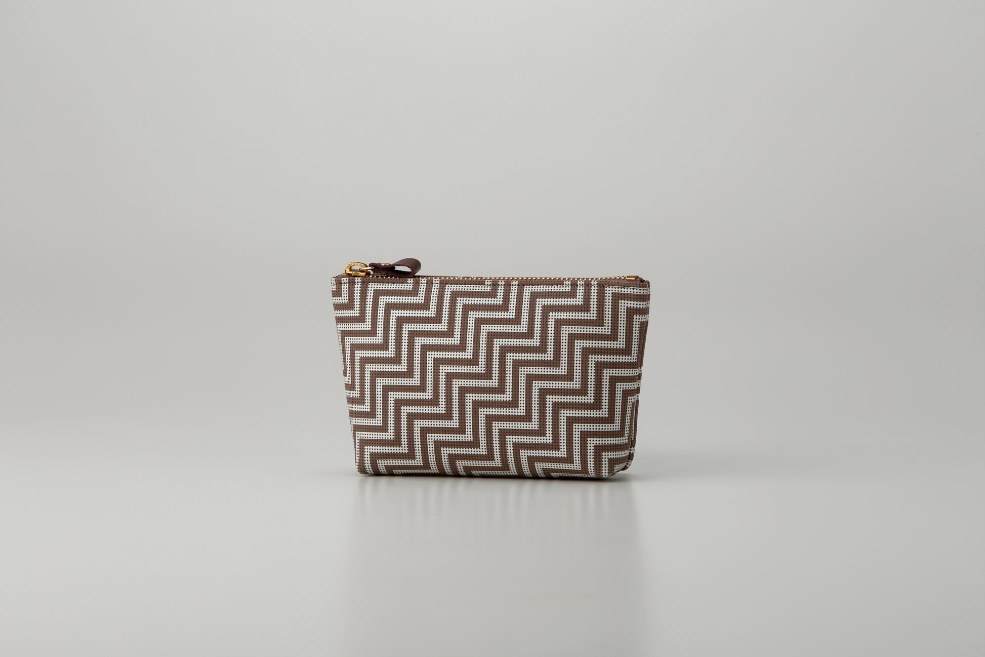 A pouch that can store makeup tools, passports, and other items. The pouch is in a rounded trapezoid shape that fits in the palm of your hand and looks cute.